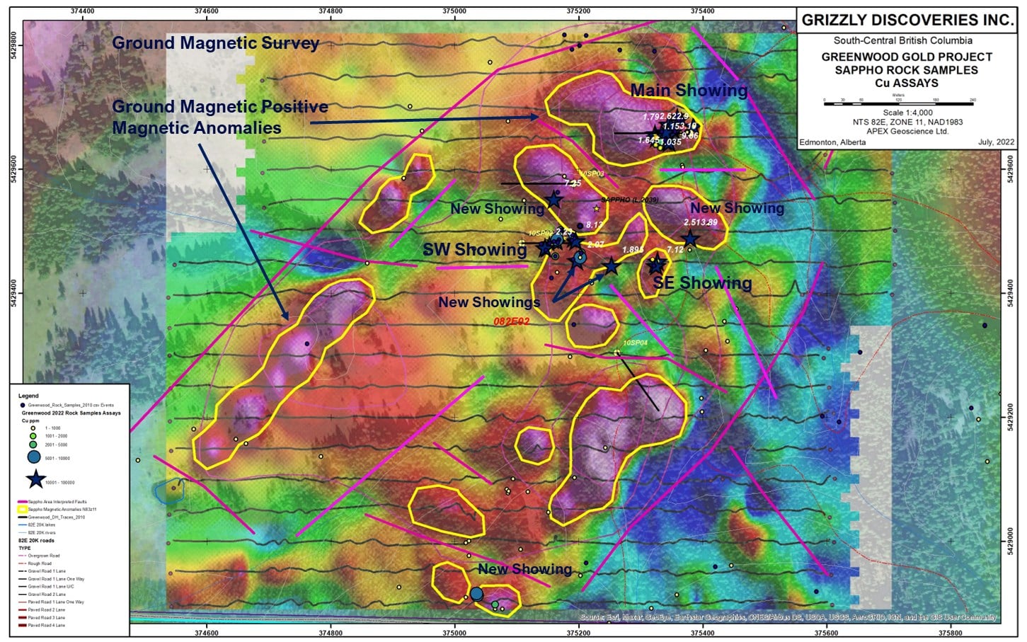 Brian "Griz" Testo, President & CEO of Grizzly Discoveries, states "New results are providing significant targets indicated by high-grade copper samples at surface. Anomalous geophysics are also outlining multiple new targets across the Sappho Project. Grizzly will continue to define these targets to the drill ready stage for the potential to define new discoveries. I would like to express deep gratitude to our outstanding prospecting team, Sebastian and Cache, for finding new showings at both the Sappho and the Midway Mine."