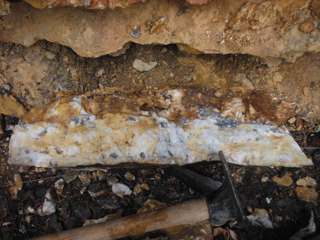 A geological crew recently visited a historical showing named the Spotted Horse – Silver Charm just west of the town of Greenwood near Motherlode Creek. The showing has seen intermittent exploration work and development since the late 1890’s and is host to several short tunnels and numerous shallow open cuts or trenches. The occurrence is a polymetallic quartz vein with silver (Ag), lead (Pb), zinc (Zn) with minor copper (Cu) and gold (Au). The quartz vein ranges from 10 cm up to 1.2 m wide in outcrop and in the workings.