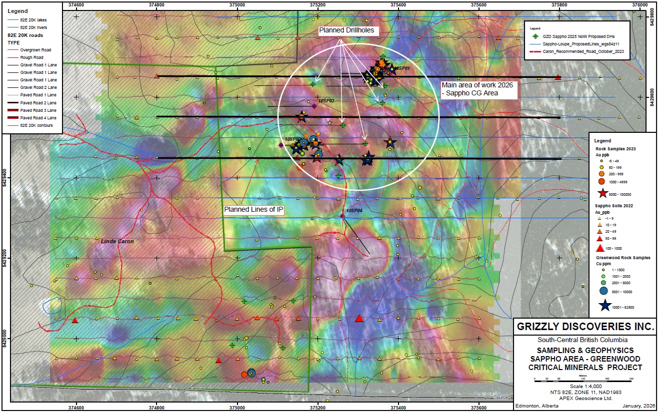 Edmonton, Alberta--(Newsfile Corp. - January 7, 2026) - Grizzly Discoveries Inc. (TSXV: GZD) (FSE: G6H) (OTCQB: GZDIF) ("Grizzly" or the "Company") is pleased to announce that it is planning an Induced Polarization (IP) and a diamond drilling program in early 2026 to follow up excellent prior results from both surface sampling and historical drilling at the Sappho Critical Minerals Target (Figure 1). In light of the current escalating metal prices for critical minerals/metals including copper (Cu), platinum (Pt), palladium (Pd), gold (Au) and silver (Ag), the Sappho Skarn/Porphyry Target warrants a new look including follow-up exploration and drilling.