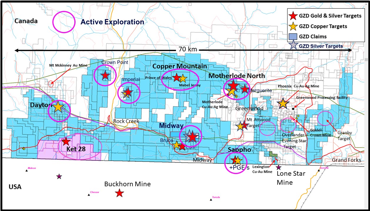 - The Motherlode - Greyhound area is being targeted for skarn copper-gold-silver and precious metal epithermal sulphide mineralization.